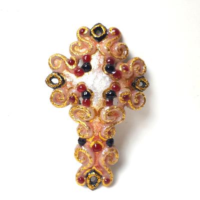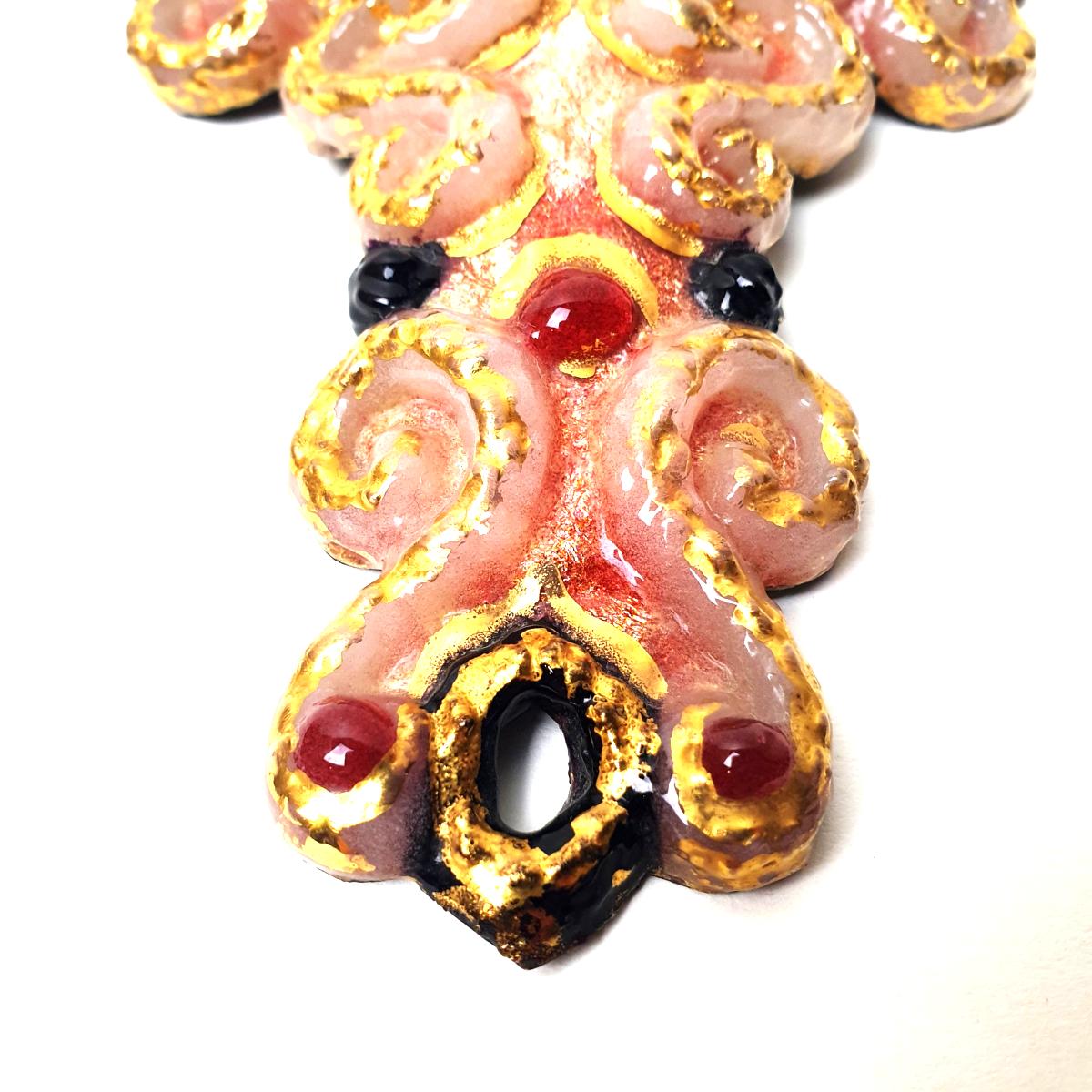 Superbe croix murale en émaux irisés blanc, rose, rouge, et noir agrémentée en pourtour de volutes dorées. Sa forme bombée et ses émaux en relief en font une vraie sculpture.