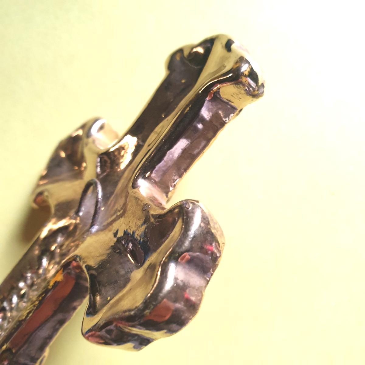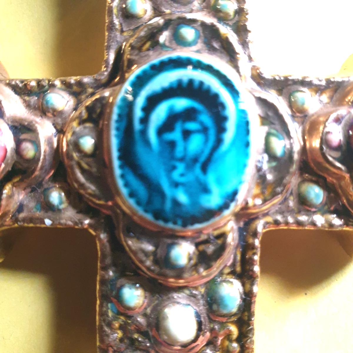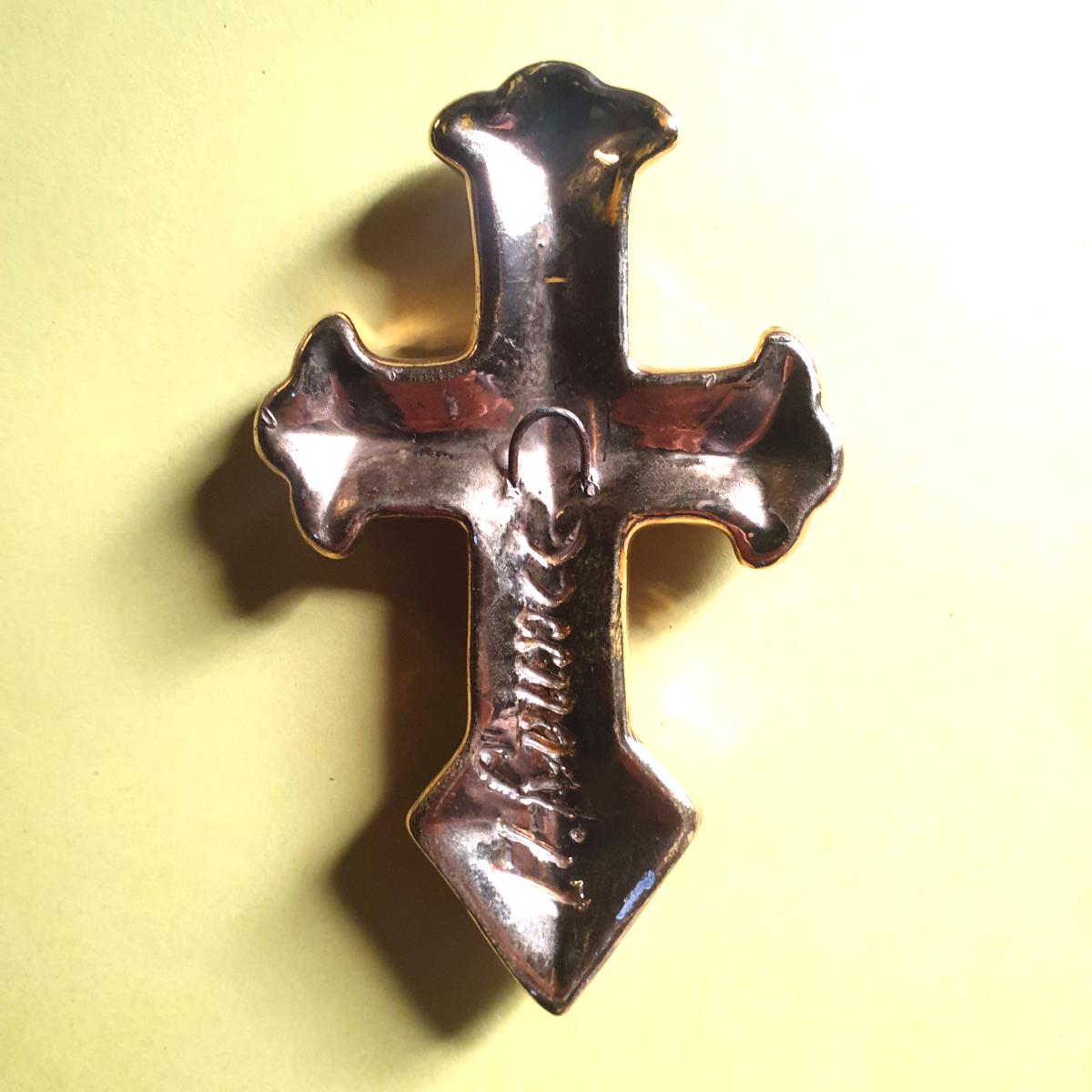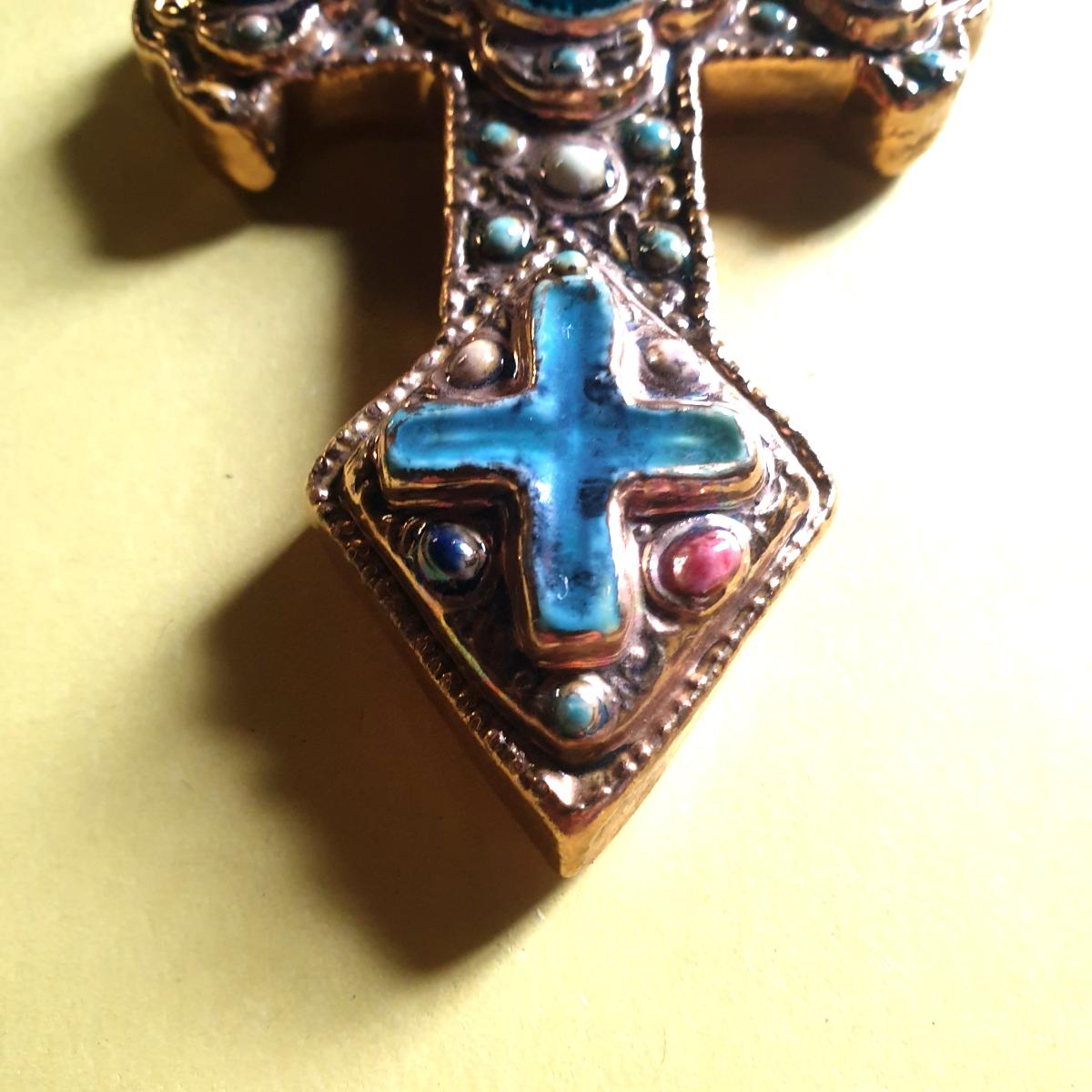 Jolie croix en céramique dorée et émaux irisés des années 60.