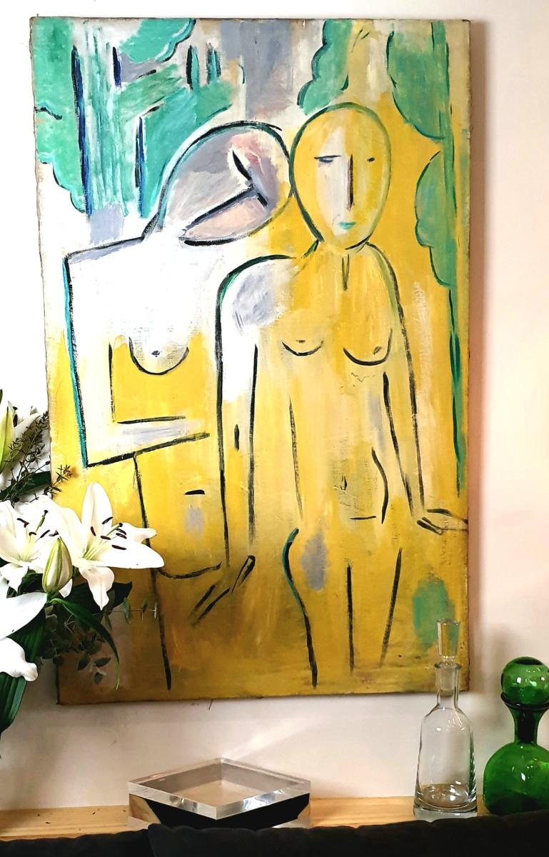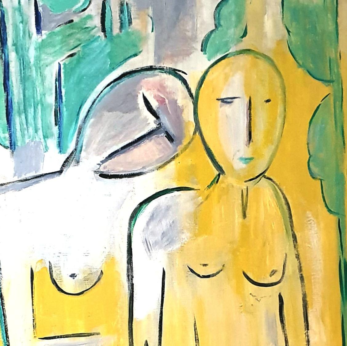 Grand tableau représentant un couple d'amoureux dans un contraste de vert et jaune et blanc où le couple est mis en avant par des contours de couleur noire.