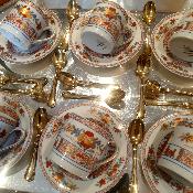 Six tasses à café au décor de la compagnie des Indes peintes à la main et relevées à l'or fin,